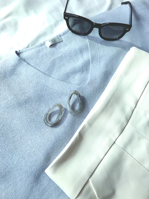 上下ともにやさしい色合いのコーデは、大きめのピアスでメリハリを出して全体のバランスをととのえて^^