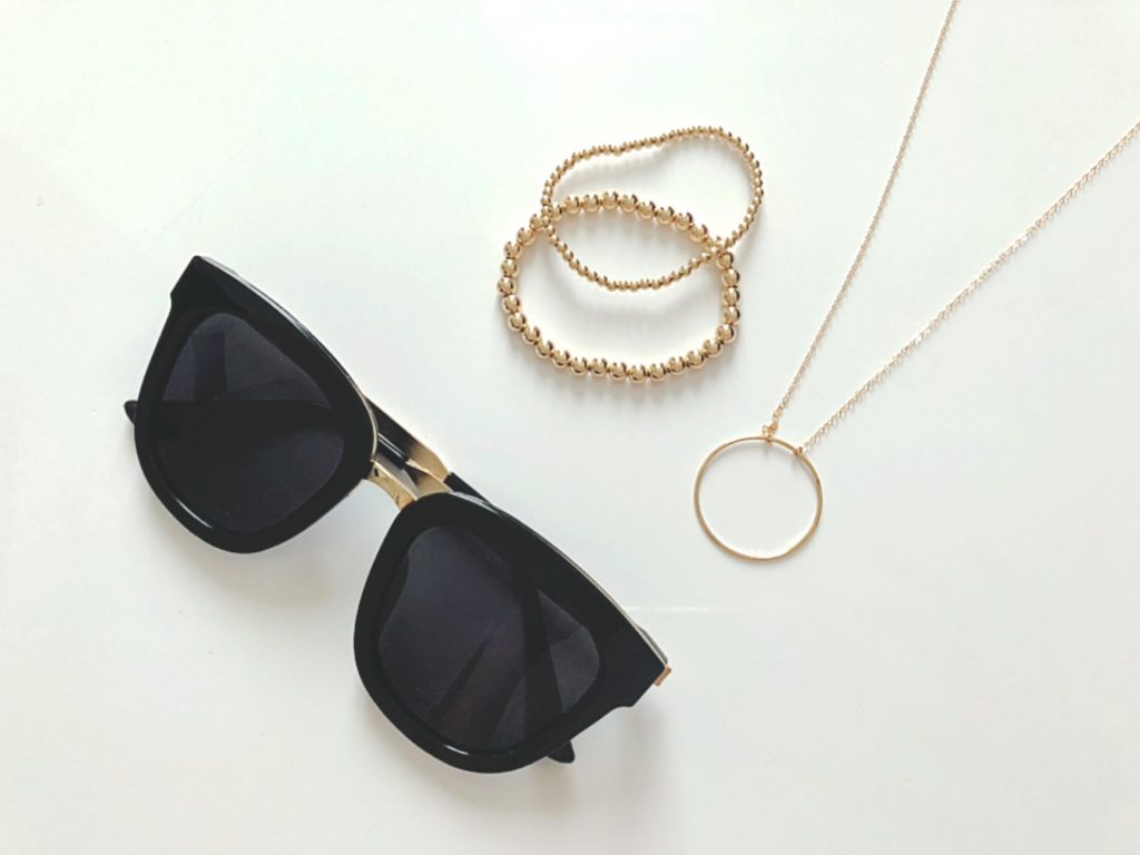 サングラスによって目元がシックになる分、肌なじみの良いサークルやラウンド型のアクセサリーで女性らしさをプラス♡